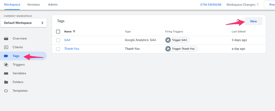After the template creation, you can now create the tag itself. Go to the Tags section and click new.