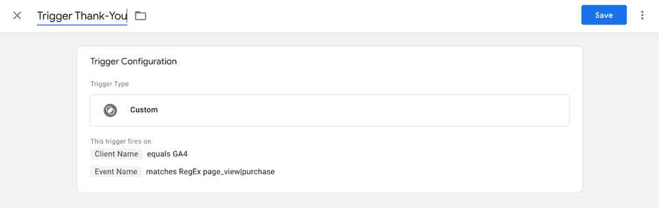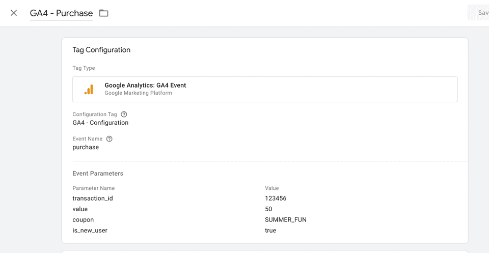 The only required parameters are transaction_id and value. The optional parameters are coupon and any other custom parameters that need to be sent to ThankYou Analytics. In our case, we had the is_new_user parameter on the server-side configuration, so we added it here.