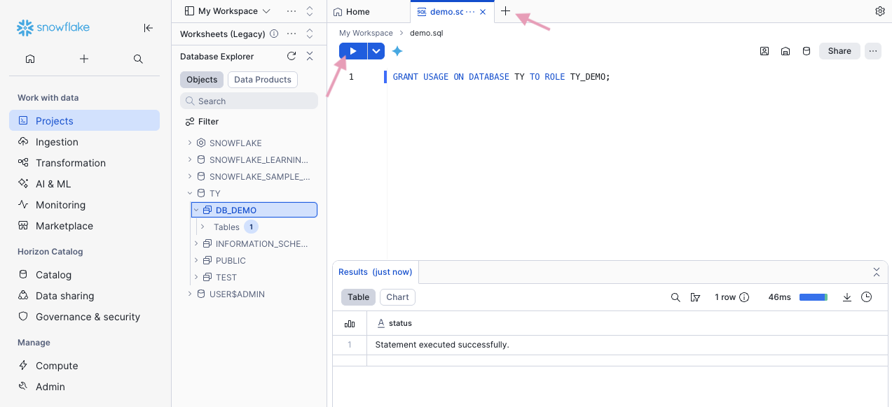Select the dedicated warehouse and database.