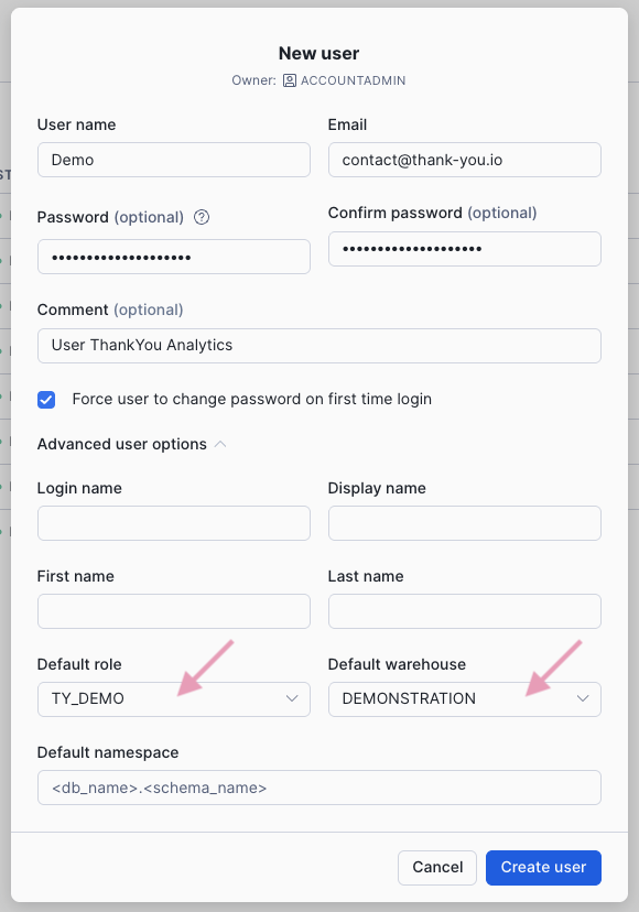 Give this user the previously created role and access to the chosen Warehouse, in the advanced options.