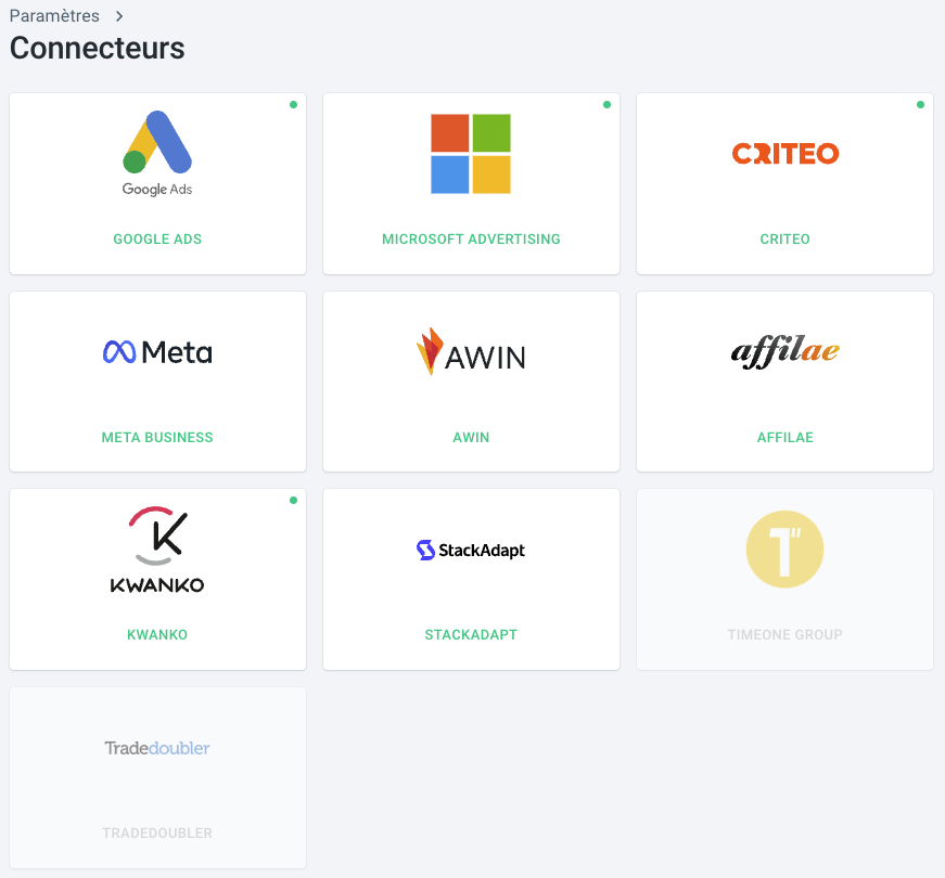Pour connecter vos plateformes, rendez-vous dans "Paramètres > Connecteurs" et sélectionnez la plateforme que vous souhaitez connecter :