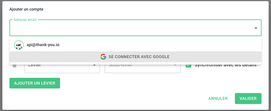 Lorsque la connexion est établie avec la régie, vous pouvez choisir dans le menu déroulant "Compte" le compte que vous souhaitez synchroniser. Vous pouvez ensuite choisir à quel(s) levier(s) et sous-levier(s) vous souhaitez synchroniser votre compte, et valider.