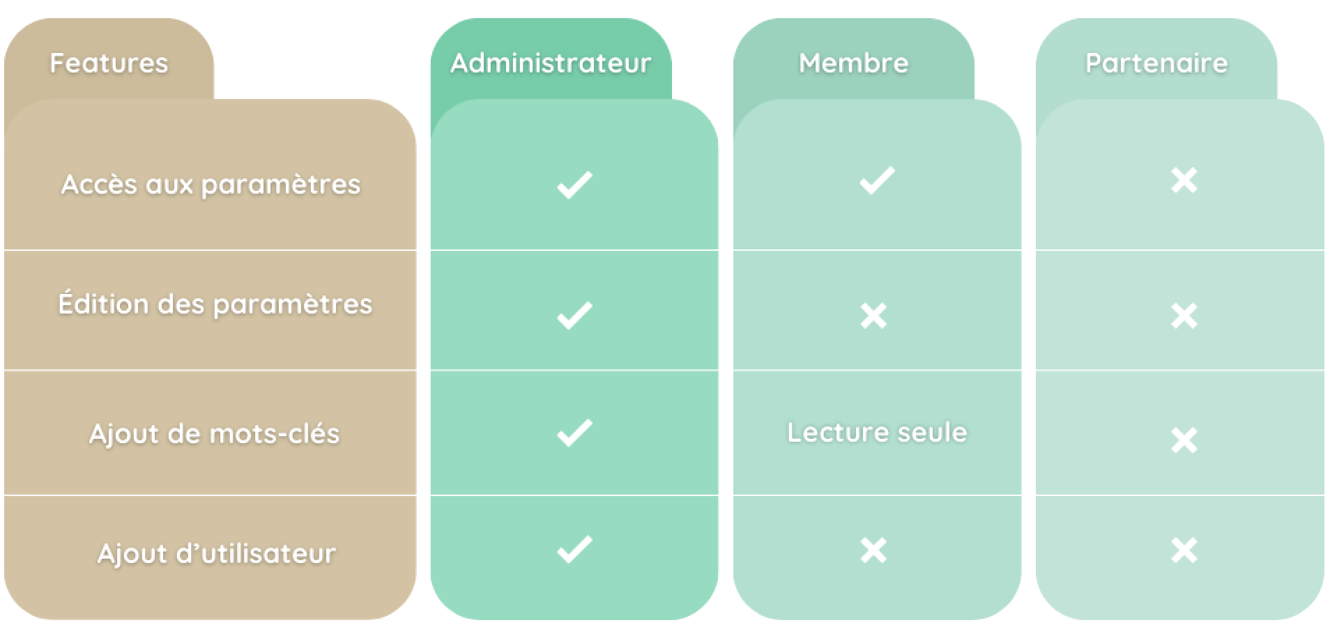Il existe trois types de rôles sur Thank-You Analytics : les administrateurs, les membres et les partenaires.